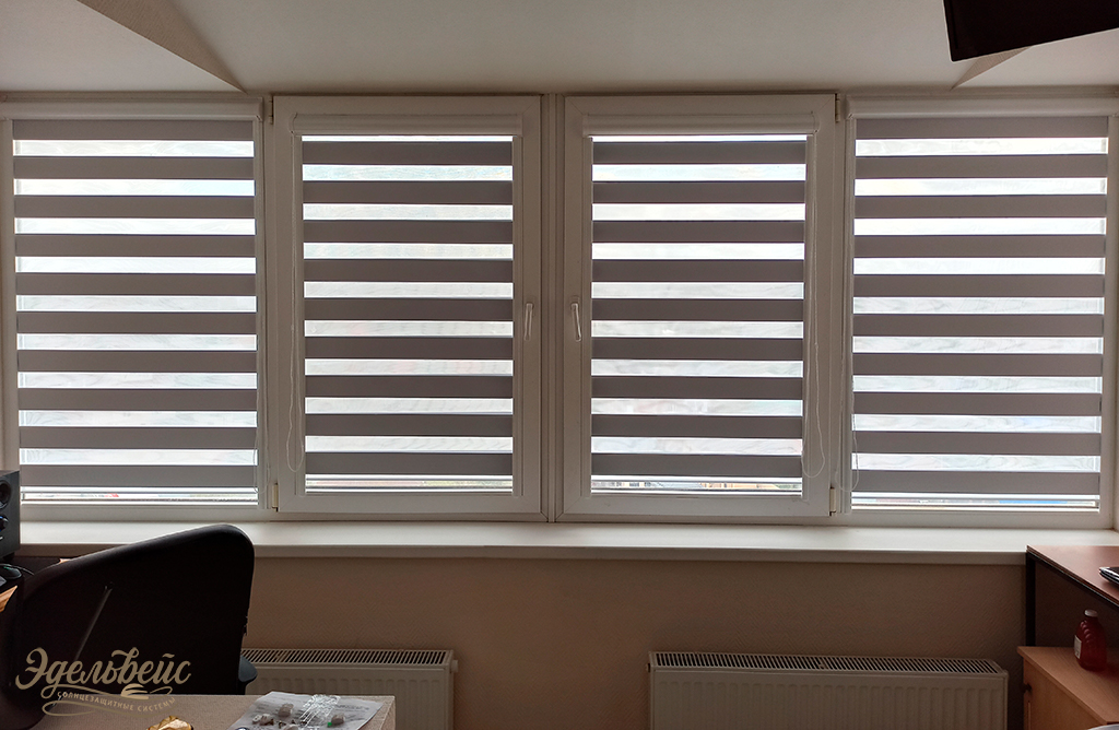 Рулонные шторы ЮНИ - стильные современные шторы на базе моделей ЮНИ-1 и ЮНИ-2, которые имеют оригинальное полотно с чередующимися полосами плотной ткани и прозрачной сетки. Предназначены для установки на рамы пластиковых и деревянных окон с углом наклона 0-15°, прямоугольным штапиком и глубиной штапика не менее 14 мм. Элегантный короб-кассета скрывает тканевый рулон и механизмы, а направляющие прикрывают от боковых просветов и провисания ткани на поворотно-откидных створках. Цепь управления фиксируется к раме с помощью держателя цепи.
